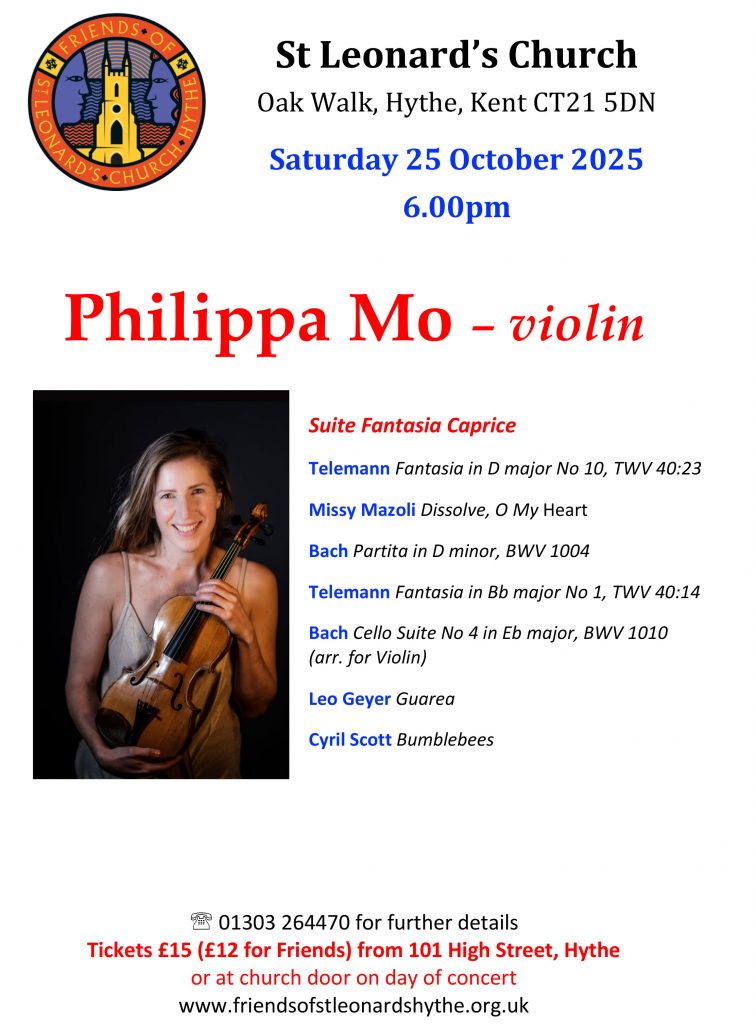 Saturday 25 October 6.00pm | £15 [Friends £12] | Philippa Mo Violin | Telemann – Fantasia No 10 in D major, TWV 40:23 Missy Mazoli – Dissolve O My Heart Bach – Partita in D minor, BWV 1004 Telemann – Fantasia No 1 in Bb major, TWV 40:14 Bach – Cello Suite No 4 in Eb major, BWV 1010 (arr. for Violin) Leo Geyer – Guarea Scott – Bumblebee |